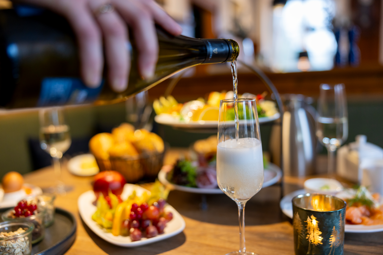 Freuen Sie sich auf herzhafte Wurstspezialitäten der regionalen Fleischerei Lohff, ausgewählten Käse, Eier vom Freilandhuhn, knusprige Brötchen und fruchtige Marmeladen. Auch die Heißgetränke und Säfte gehören fest dazu. Ein Glas prickelnder Secco pro Person ist ebenfalls inklusive! Auf Wunsch können Sie besondere Extras wie norwegischen Räucherlachs oder Travemünder Roastbeef ergänzen.